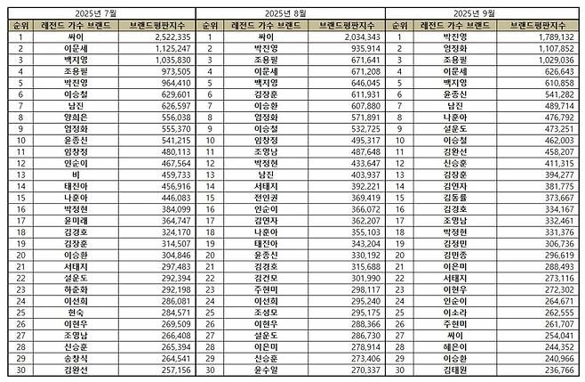 한편 2025년 9월의 레전드 가수 브랜드평판 분석 결과에서는 1△박진영 △엄정화 △조용필 △이문세 △백지영 △윤종신 △남진 △나훈아 △설운도 △이승철이 1위부터 10위까지 차지했으며 이어 11위부터 20위에는 △김완선 △신승훈 △김장훈 △김연자 △김동률 △김경호 △조영남 △박정현 △김정민 △김민종이 이름을 올렸다.